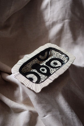 Småskalig keramik i stengodslera med prickar och perfekt operfektion. Skapad på Herrhagen i Karlstad.